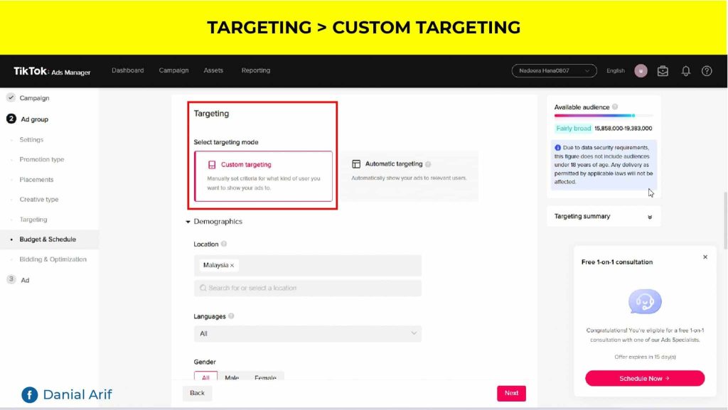 Namun, jika anda mahukan menentukan kriteria tersendiri untuk iklan anda, boleh pilih custom targeting.