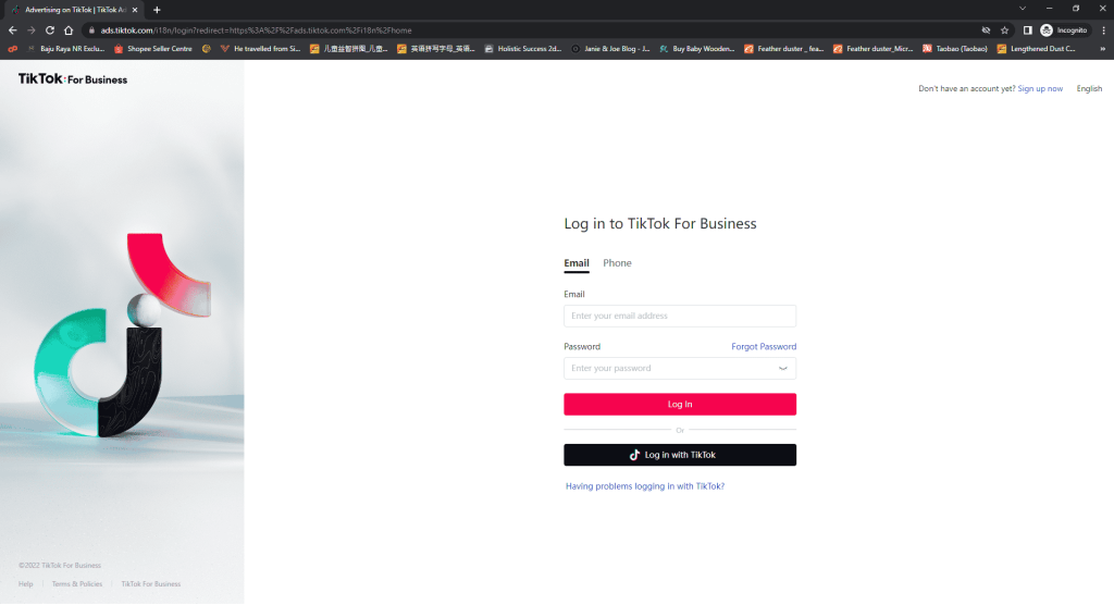 Sekiranya anda masih tidak ada sebarang akaun Tiktok Ads, anda perlulah mendaftar terlebih dahulu. Anda boleh pilih sama ada anda mahu mendaftar menggunakan ‘email address’ ataupun phone.