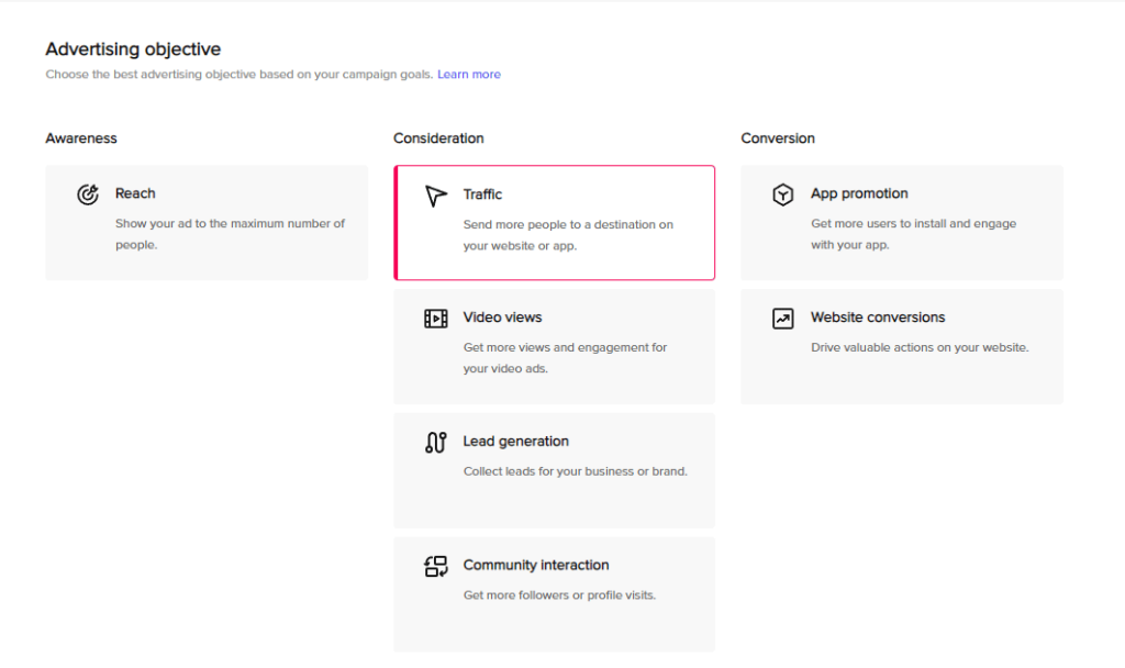 - Traffic: Tarik trafik ke URL laman web atau instant page TikTok
