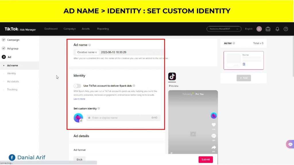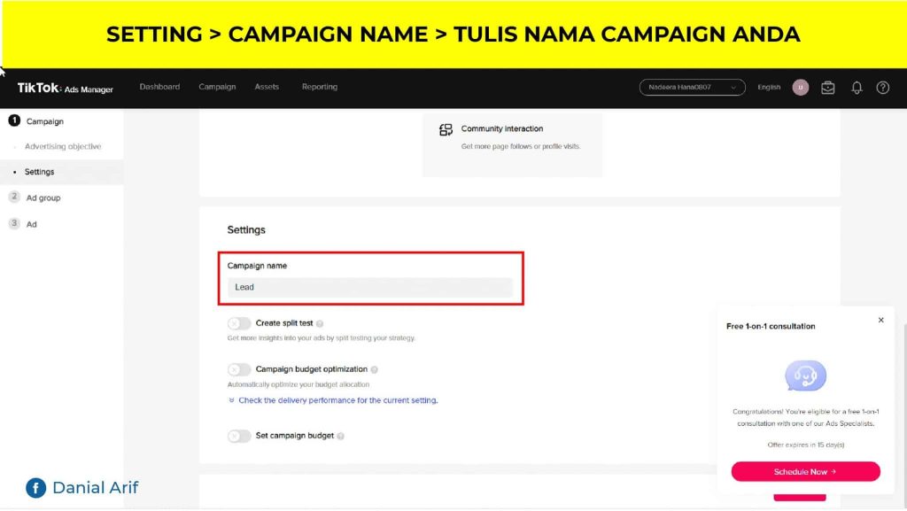 Sama macam kita buat FB Ads, cara buat TikTok Ads pun kena mula dengan, berikan nama untuk kempen ini.